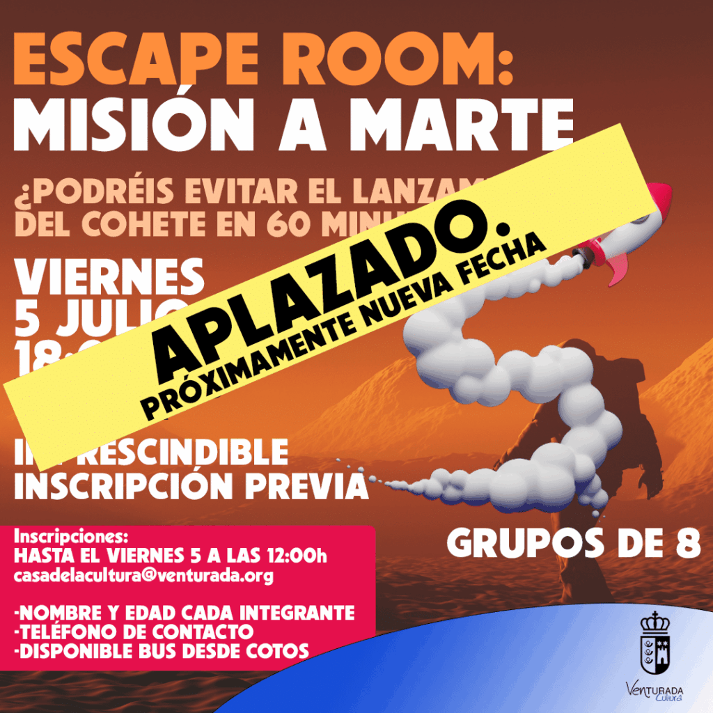 ¡APLAZADO! Próximamente anunciaremos la nueva fecha. Escape room participativo, “Misión a Marte”, en el que descubrir pistas resulta determinante. La actividad se desarrollará en el polideportivo de Venturada, siendo el campo de fútbol el punto de partida. El grupo ganador recibirá un premio por valor de 100 euros para canjear en cualquier establecimiento hostelero […]