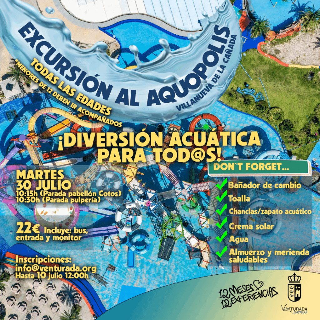 Da igual la edad que tengas para pasar un día de diversión acuática. ¡Corre apúntate que aún quedan plazas! El 30 de julio nos vamos al Aquopolis. Inscríbete en info@venturada.org. Fecha límite de inscripción: Miércoles 10 de julio a las 12:00h. *Los menores de 12 años deberán ir acompañados de un adulto.