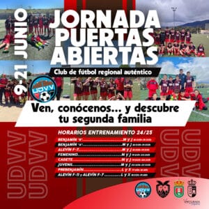 FÚTBOL CON VALORES – TEMPORADA 25-26 ¡Inscripciones abiertas desde el 11 de agosto! Vive el fútbol de verdad: compañerismo, compromiso y pasión en cada entrenamiento. Únete a la Unión Deportiva Vellón Venturada. Categorías desde Prebenjamín hasta Juvenil Cuotas accesibles Equipación incluida Más info: udvellonventurada@gmail.com ¡Forma parte de la familia UDVV!