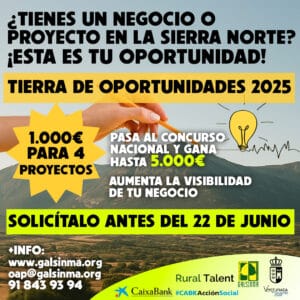 ¿Tienes un negocio o proyecto en la Sierra Norte de Madrid? ¡Participa en los Premios Tierra de Oportunidades 2025! 4 proyectos recibirán 1.000 € y podrán optar a 5.000 € más a nivel nacional. Apoyamos el talento local y damos visibilidad a tu emprendimiento. Requisitos: Residir en municipios < 5.000 hab. (hasta 10.000 si