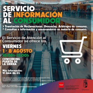 El servicio de información al consumidor presencial en el mes de septiembre tendrá lugar los viernes 5 y 12, de 10h a 13h en el Coworking Puerta de la Sierra. Podrás tramitar reclamaciones, denuncias, arbitrajes de consumo, realizar consultas y recibir información y asesoramiento en materia de consumo. Más info: