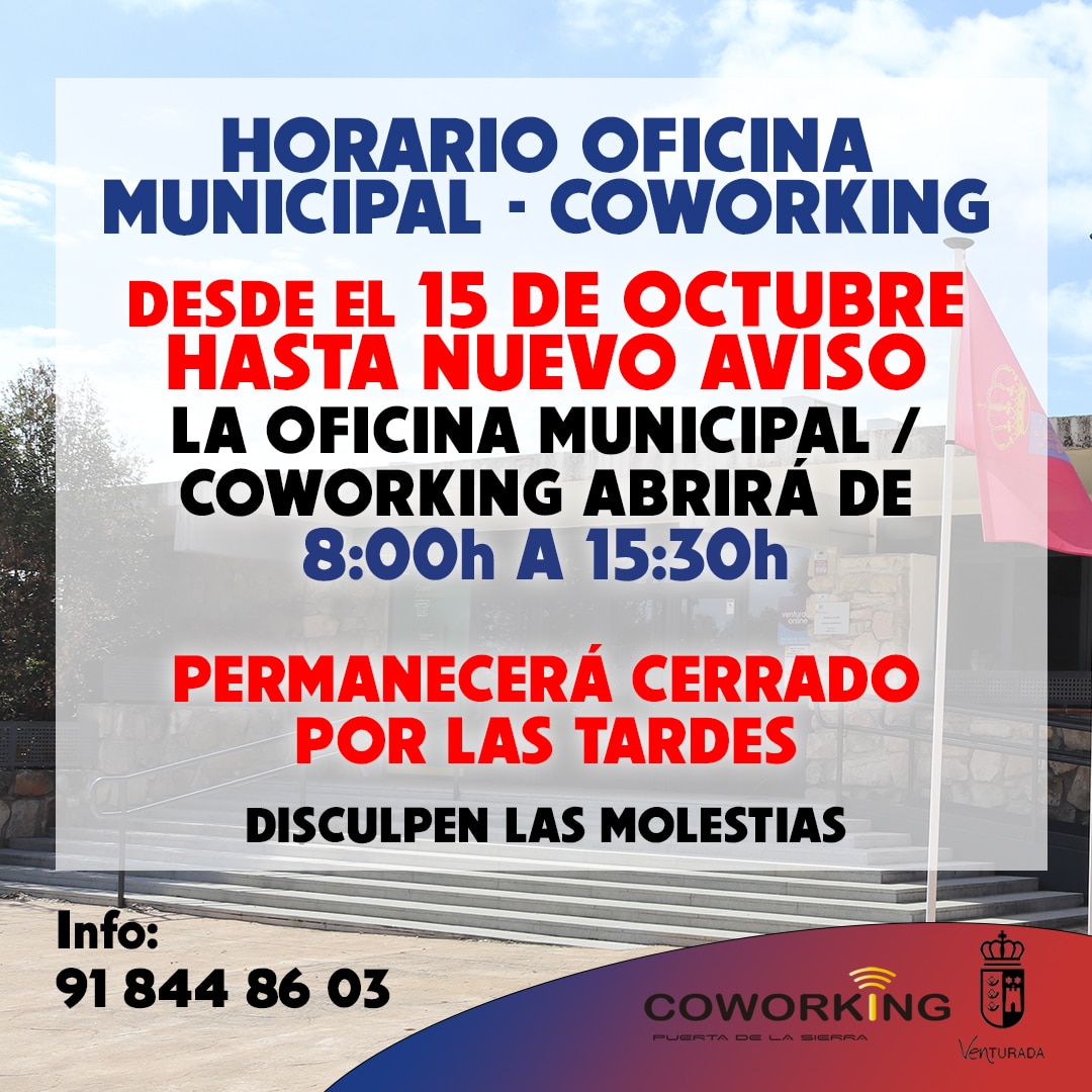 Desde el miércoles 15 de octubre, hasta nuevo aviso, la Oficina Municipal / Coworking abrirá