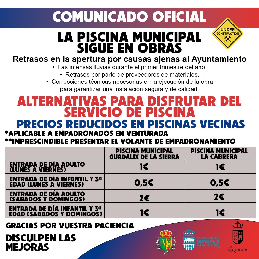Desde el Ayuntamiento, hemos trabajado con la máxima rapidez para que nuestros vecinos y vecinas puedan seguir disfrutando del verano. Por ello, hemos acordado precios reducidos para empadronados en Venturada en las piscinas municipales de La Cabrera y Guadalix de la Sierra (presentando el volante de empadronamiento).