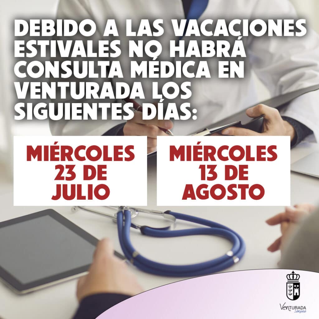 Debido a las vacaciones estivales ☀️, no habrá consulta médica en Venturada los días: