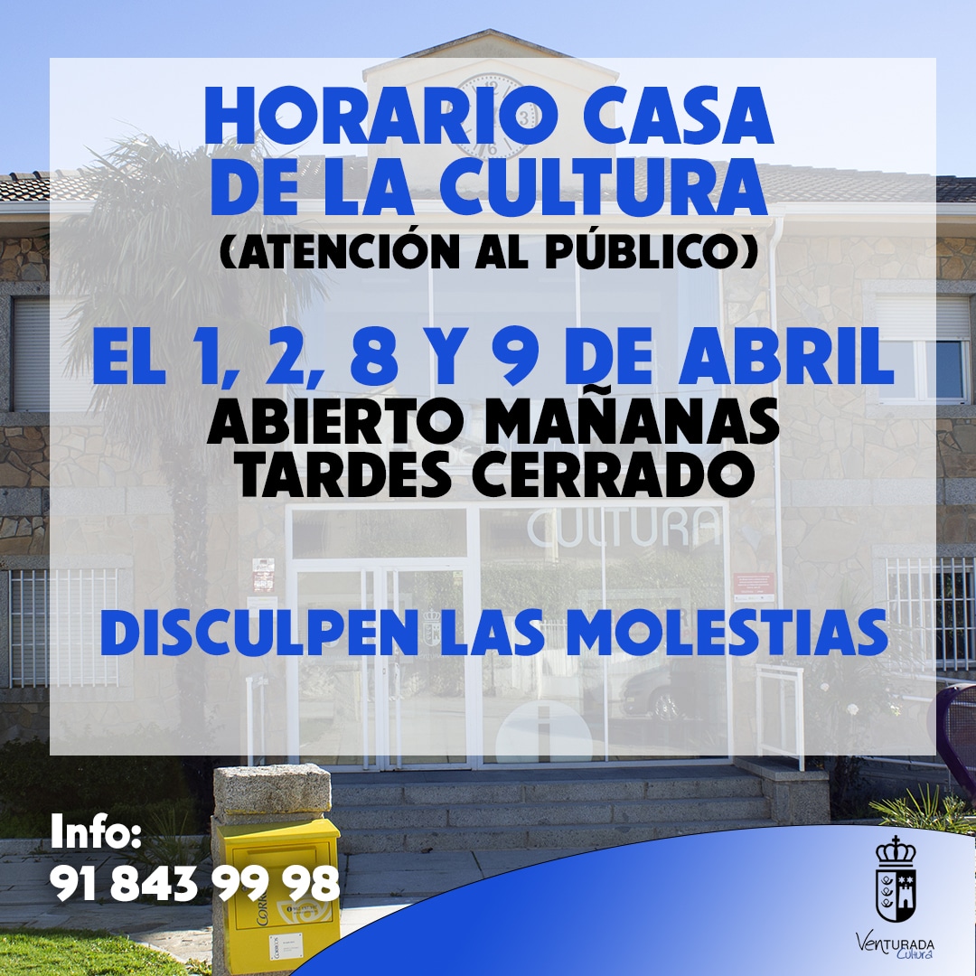 La atención al público en la Casa de la Cultura de Venturada en los días indicados, será solo de mañana, por las tardes permanecerá cerrado.