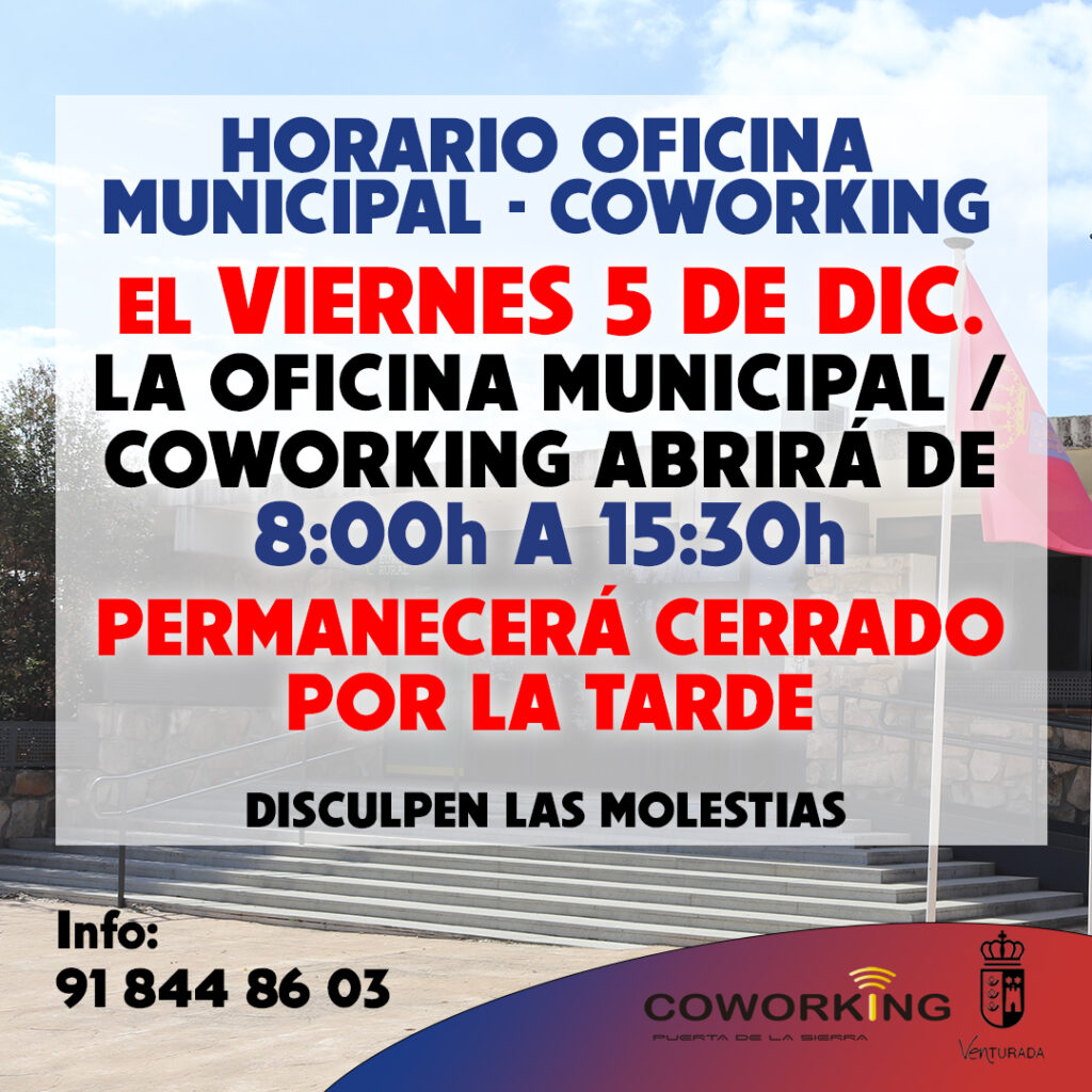 AVISO. El viernes 5 de diciembre la Oficina Municipal / Coworking abrirá de 8h a 15:30h.