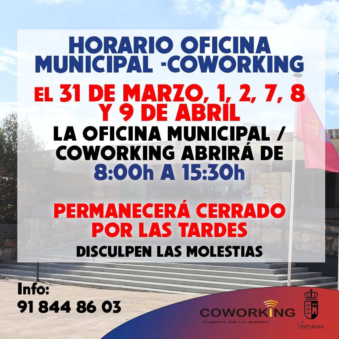 La Oficina Municipal / Coworking, los días indicados, permanecerá cerrado por las tardes. Disculpen las molestias.