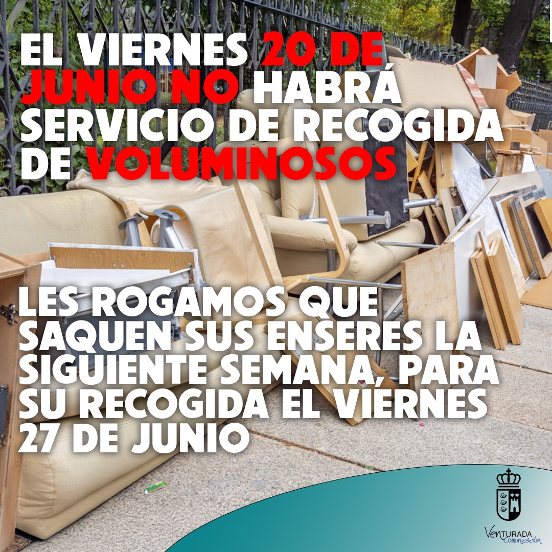 Este viernes 20 de junio NO HABRÁ servicio de recogida de voluminosos.