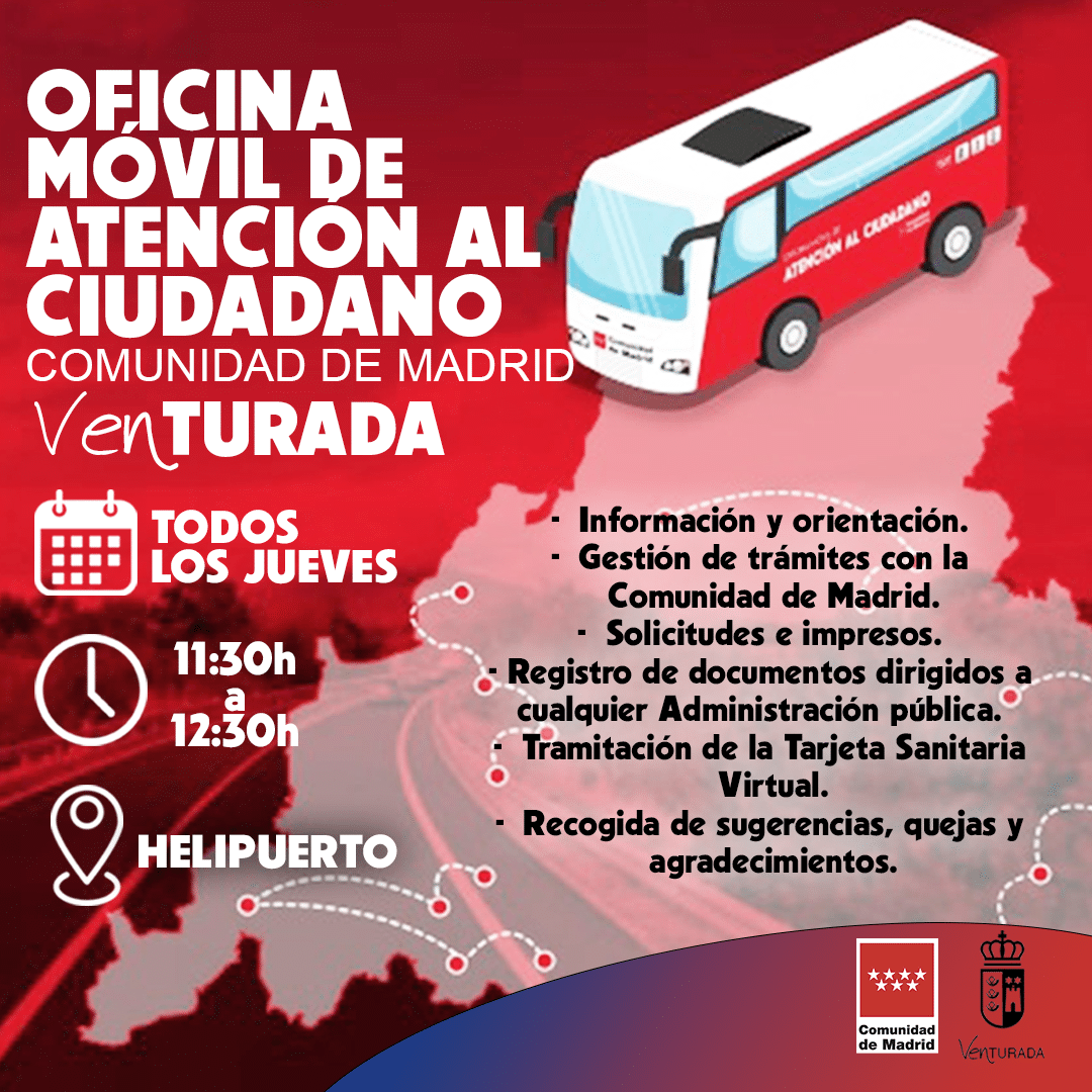La Oficina Móvil de Atención al Ciudadano presta servicio en Venturada todos los jueves, excepto festivos nacionales y de la Comunidad de Madrid, en el Helipuerto, de 11:30h a 12:30h.