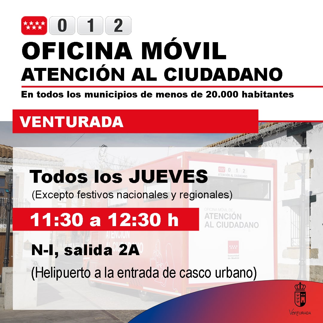 La Oficina Móvil de Atención al Ciudadano presta servicio en Venturada todos los jueves, excepto festivos nacionales y de la Comunidad de Madrid, en el Helipuerto, de 11:30h a 12:30h.