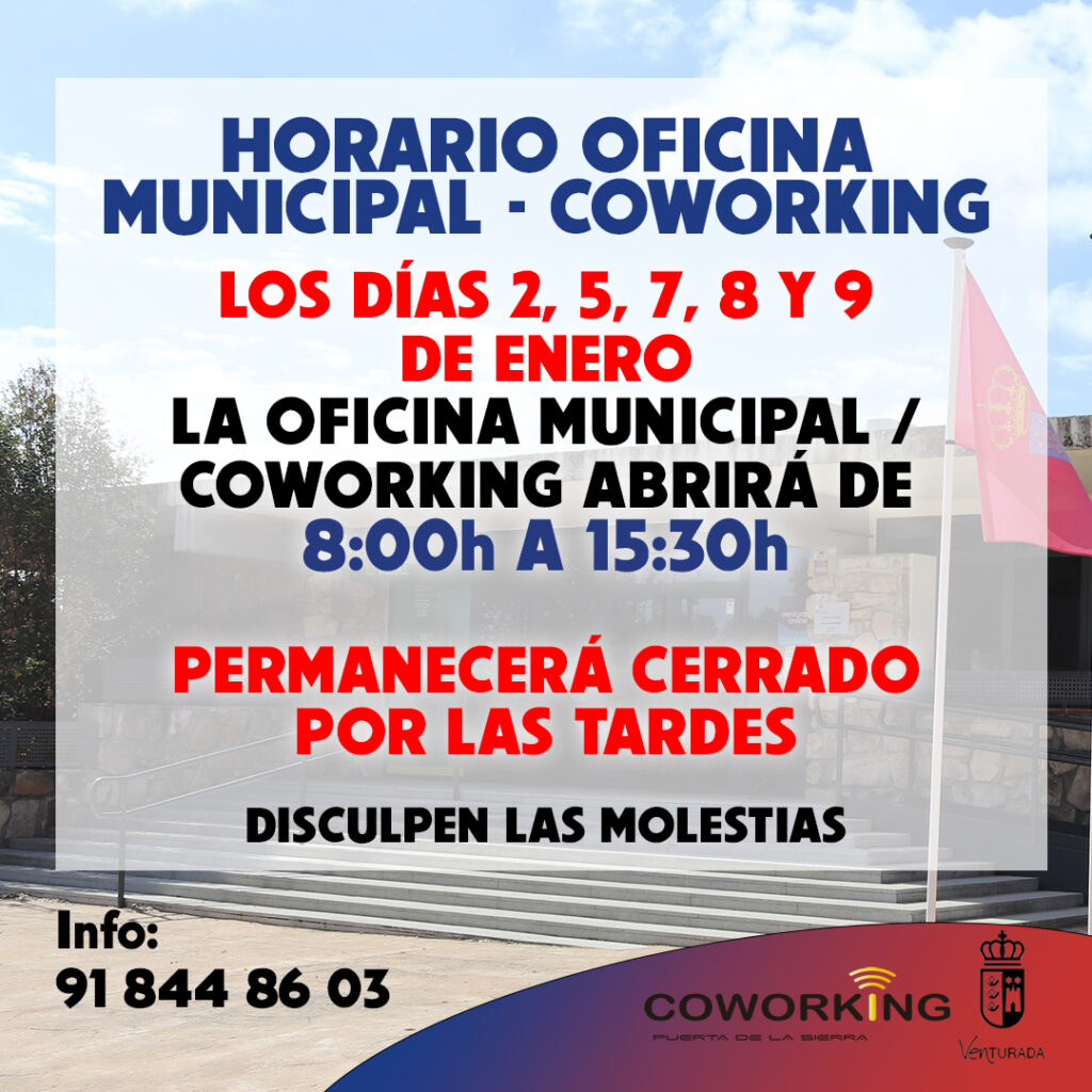 Los días 2, 5, 7 8 y 9 de enero la Oficina Municipal / Coworking abrirá de 8h a 15:30h.Permanecerá cerrado por la tarde.