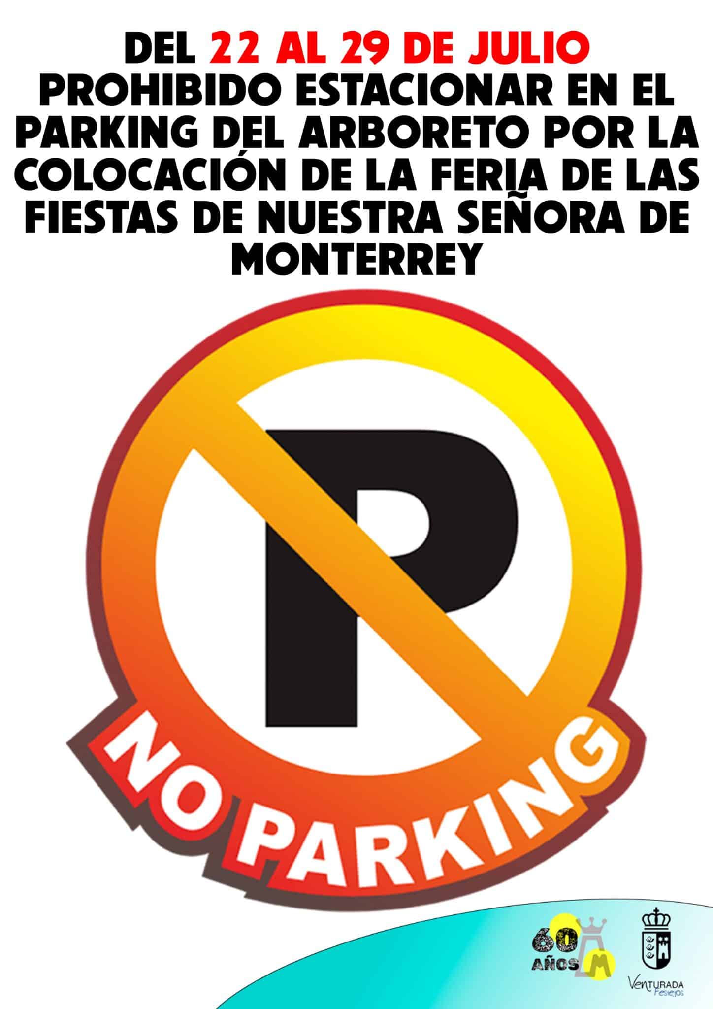 Con motivo de la celebración de las Fiestas de Nuestra Señora de Monterrey, se prohíbe estacionar en el parking del arboreto (Detrás del Restaurante Génova) del 22 al 29 de julio, ya que será el lugar habilitado para la feria.