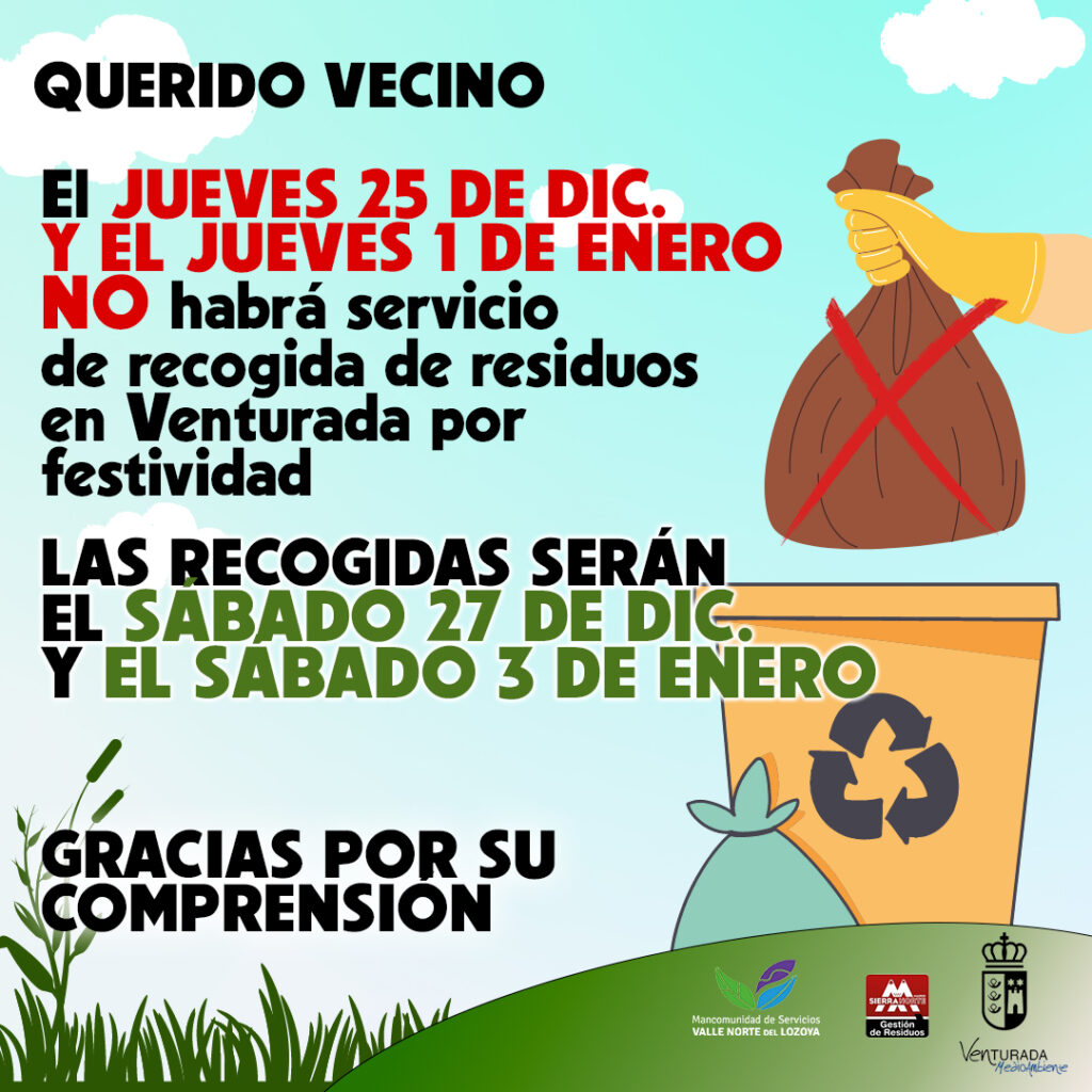 No habrá servicio de recogida de residuos en Venturada debido a festividad.