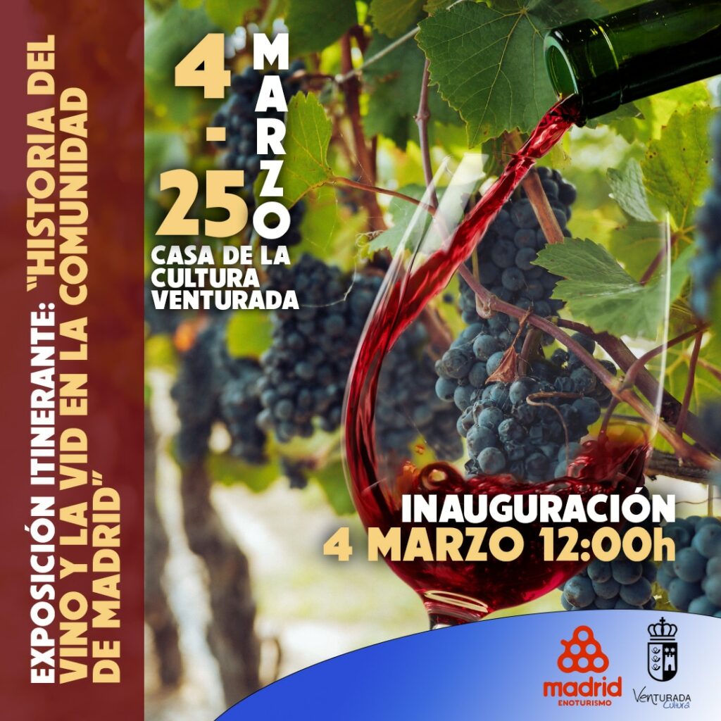 La Exposición Itinerante de la «Historia del Vino y laVid en la Comunidad de Madrid», llega a Venturada. Desde el martes, 4 de marzo hasta el 25 de marzo, se podrá visitar en el Casa de la Cultura de Venturada, en horario de lunes a viernes de 10:00 a 13:00h y de 17:00h a 20:00h.