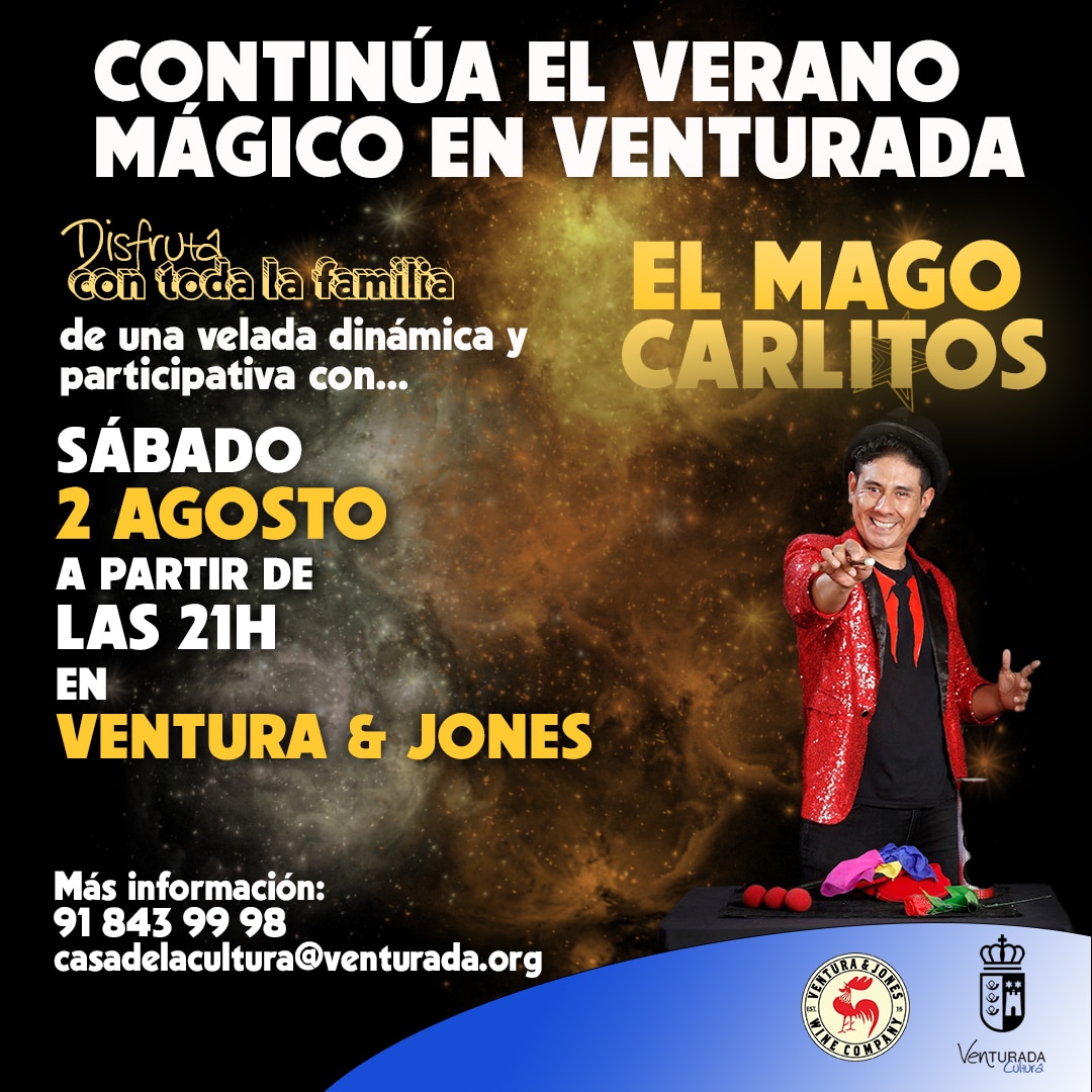 El próximo sábado 2 de agosto, te esperamos a partir de las 21:00 h en Ventura & Jones para disfrutar de una noche llena de ilusión con la actuación del increíble Mago Carlitos.