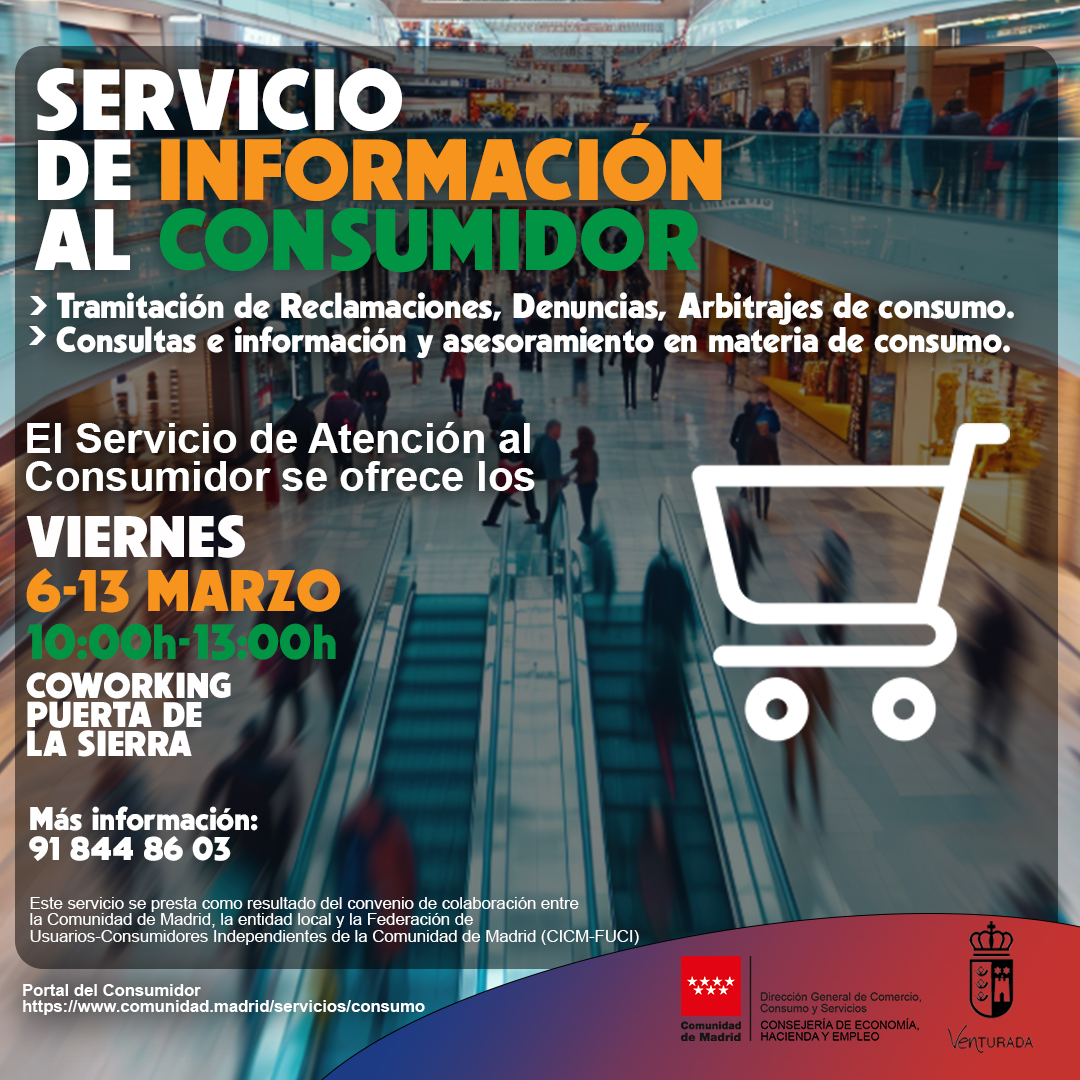 El servicio de información al consumidor presencial en el mes de marzo tendrá lugar los viernes 6 y 13, de 10h a 13h en el Coworking Puerta de la Sierra.